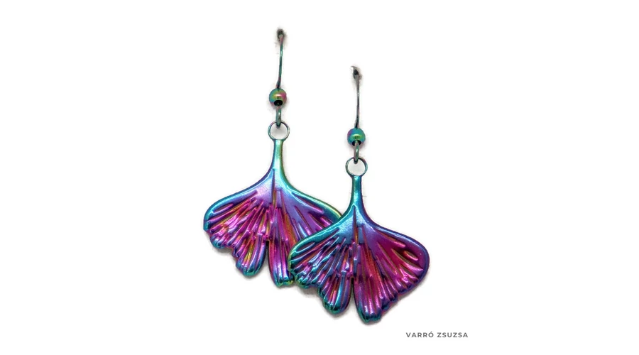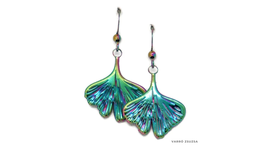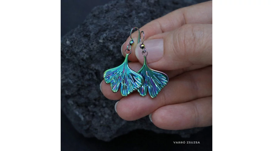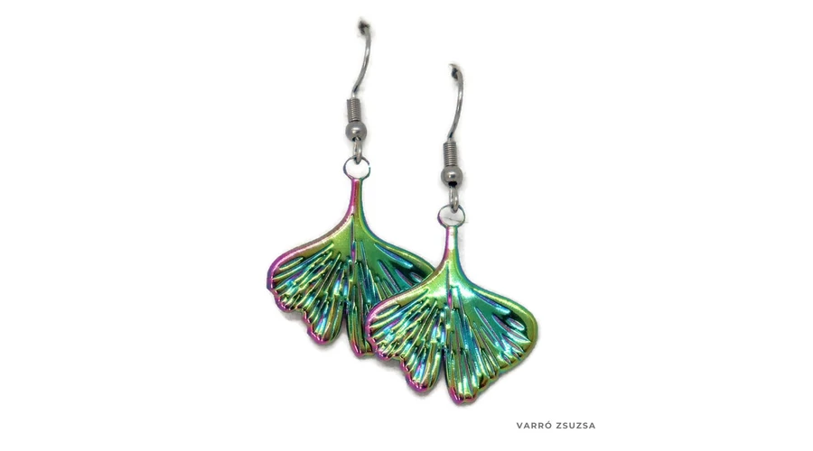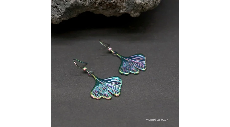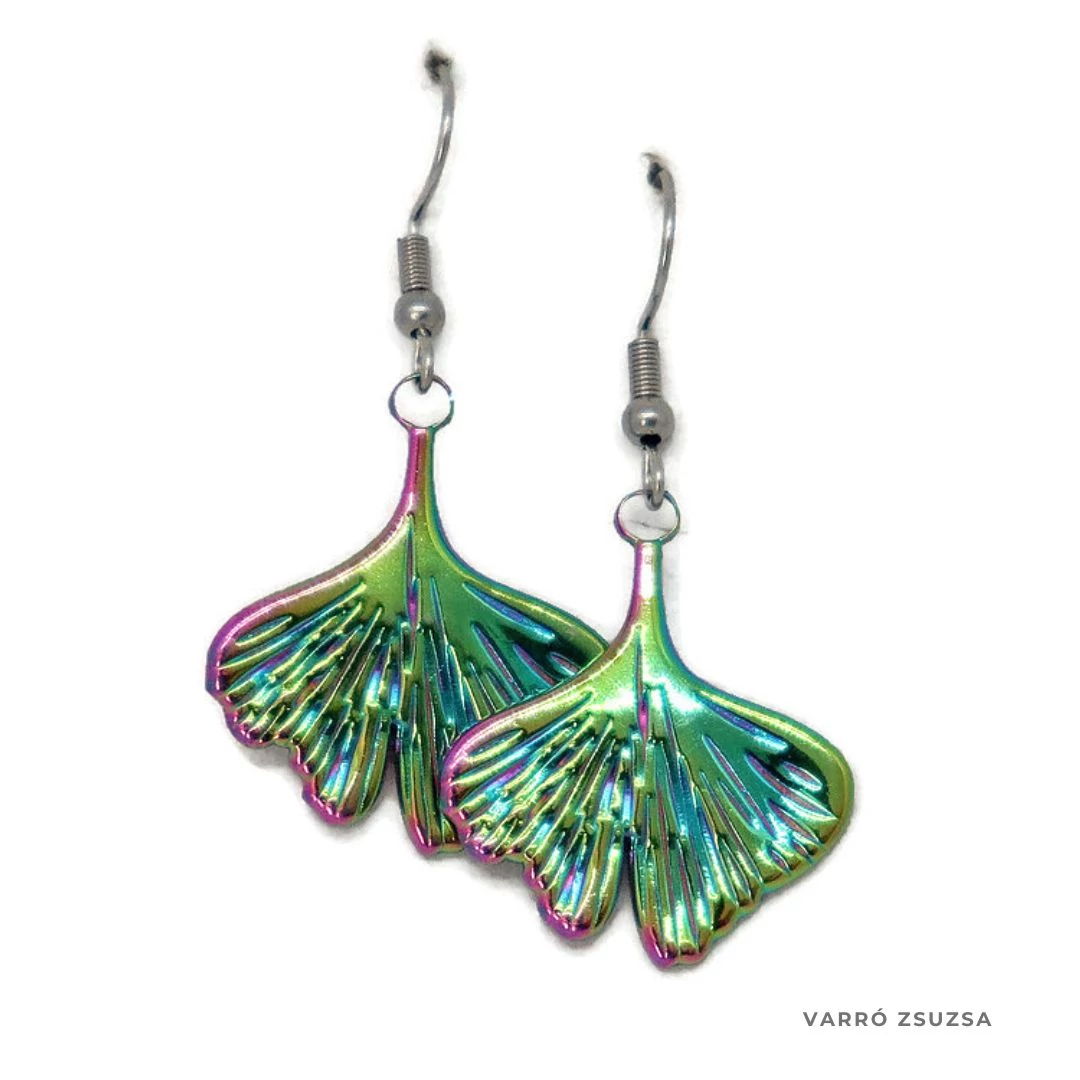 Szivárvány acél fülbevaló – Ginkgo biloba levél