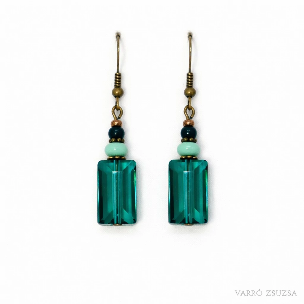 Letisztult elegancia három árnyalatú zöldben. A csiszolt üveggyöngy finoman tükrözi a fényt, míg az antik réz színű részletek meleg kontrasztot adnak az összhatásnak. Fő jellemzők: